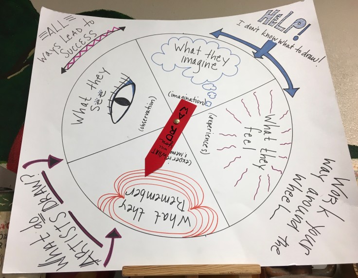 The next time we meet, students complete a quick worksheet tocheck for understanding. They work with their table mates (think-pair-share style) to identify the four things artist draw and then reflect on their own strengths and weaknesses. Helping them zero in on what their preferences are helps inform their future practice as artists and it helps me guide them.