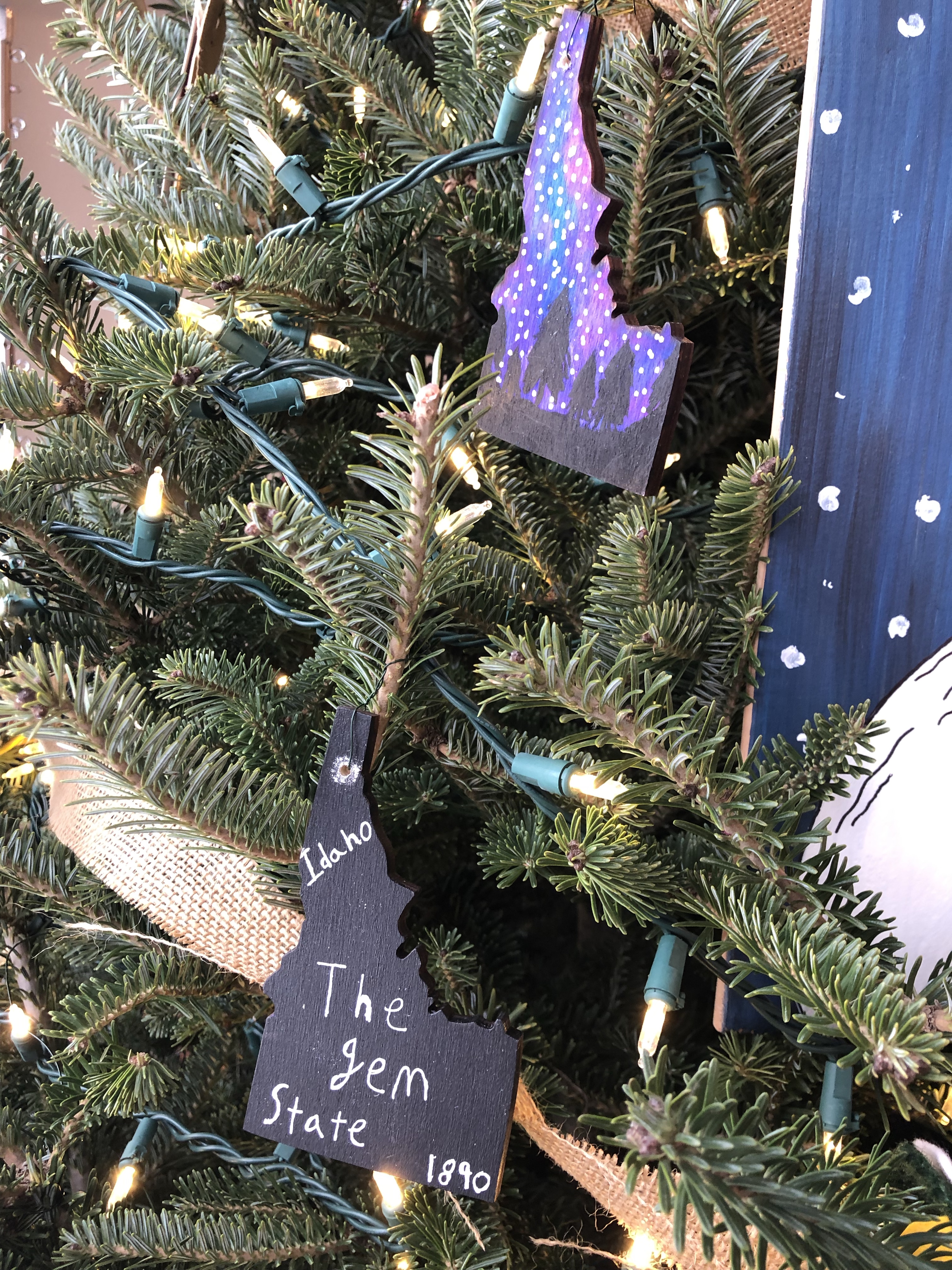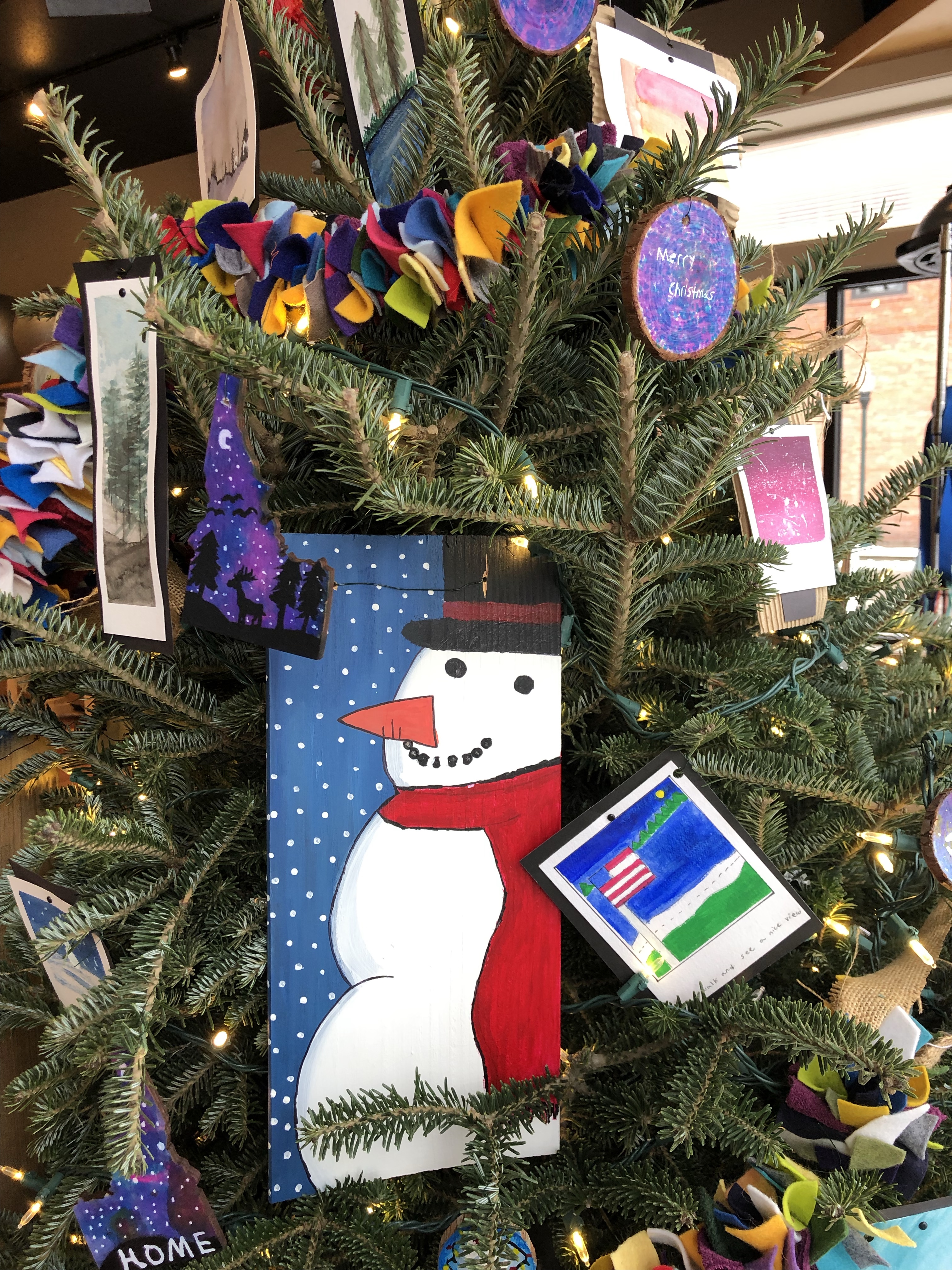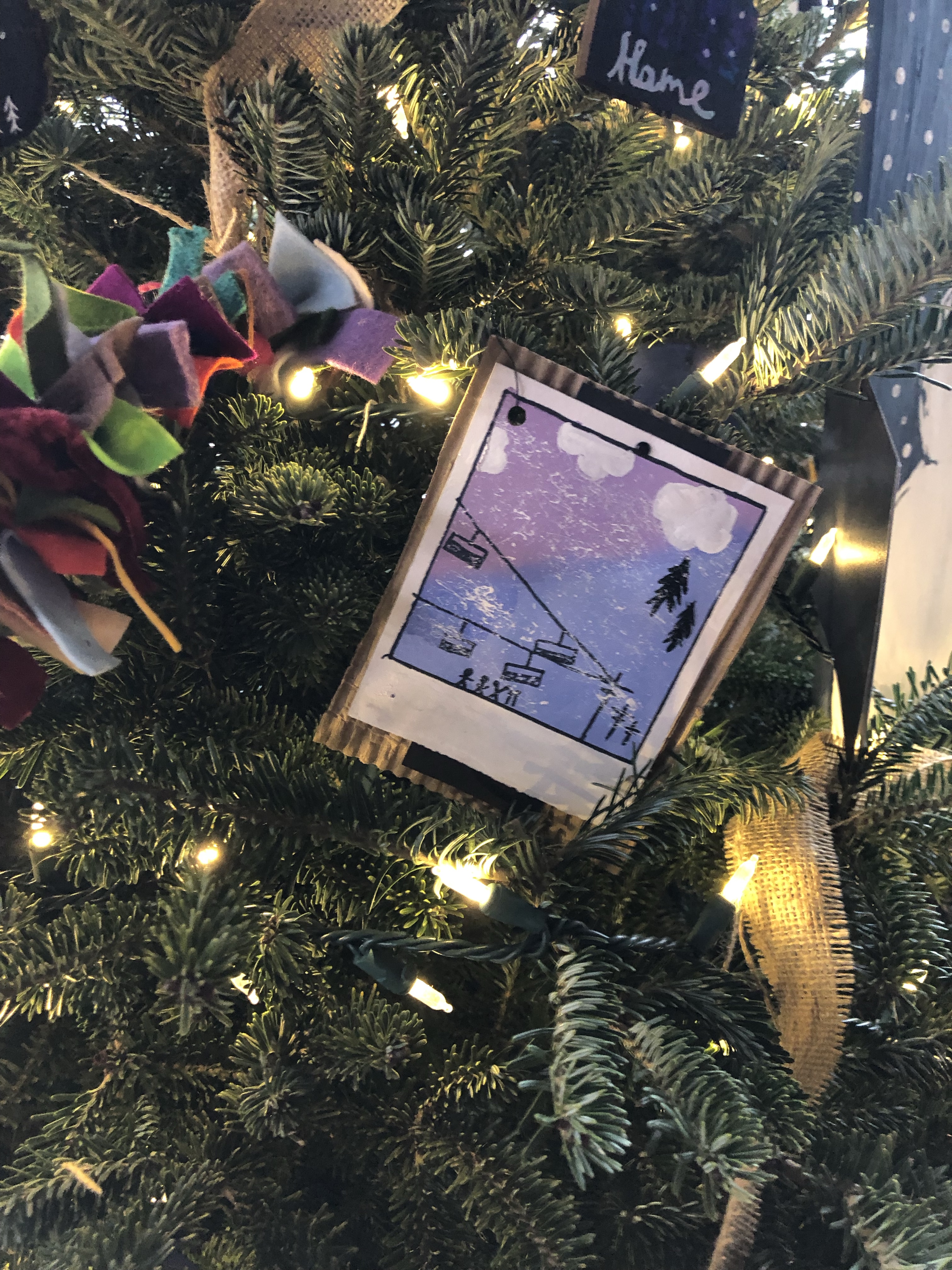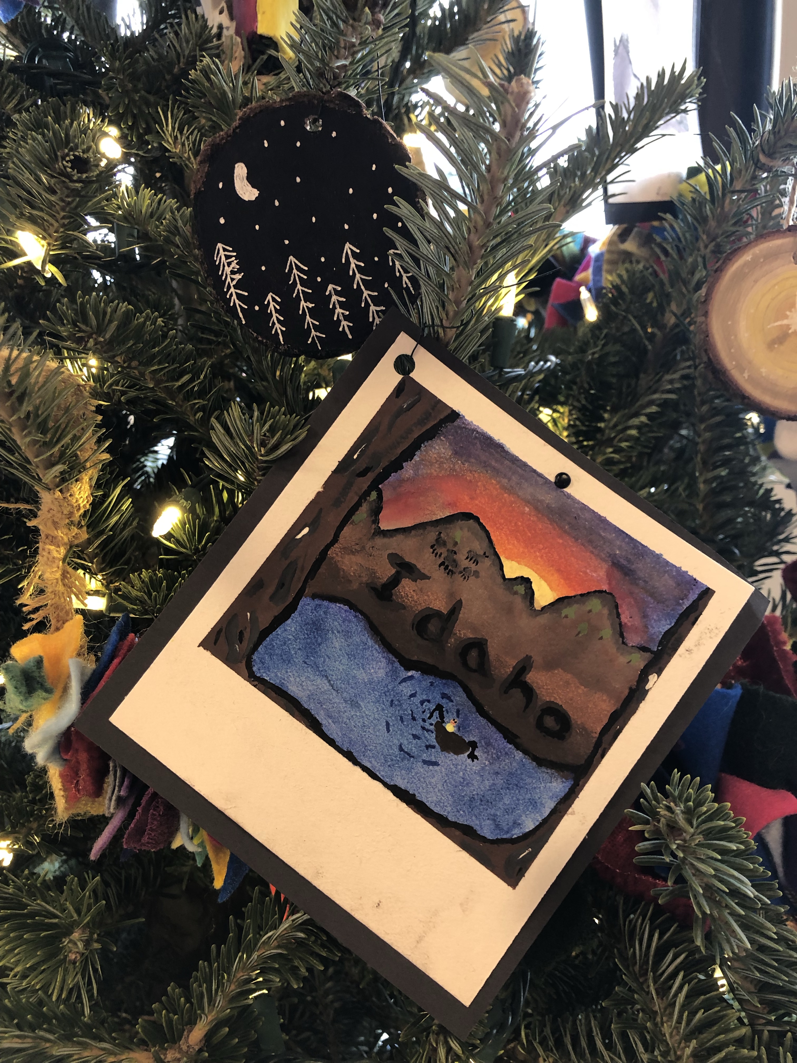 Kinderhaven’s festival of trees is again happening in virtual form. Our theme this year is “Greetings from Idaho”. I asked my middle school students to reflect on things that we love about our state and to consider what makes Idaho special to them. We then represented those ideas with fun ornaments, like handpainted “Polaroid” landscapes, garland and a unique tree topper.